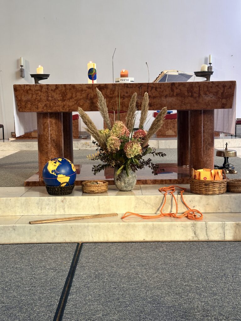 Die Kerze, mit der Weltkugel auf dem Altar, ist das Licht der Hoffnung, das wir den Menschen im Südsudan bringen wollen, es drückt unsere besondere Verbundenheit mit ihnen aus.