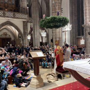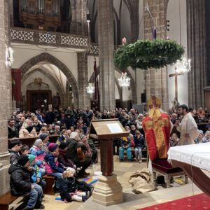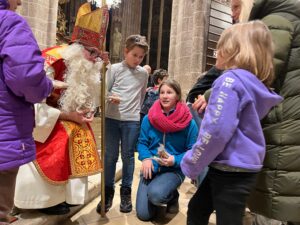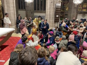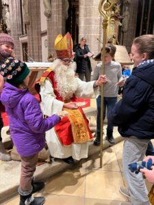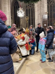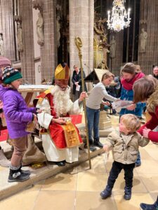 Große Aufregung herrschte am Samstag, dem 6. Dezember, als der Nikolaus an das große Eingangstor der Pfarrkirche klopfte! Mehr als 100 Kinder beobachteten mit großen Augen jede Bewegung des Nikolaus, der durch den Mittelgang nach vorne zum Altar schritt. Der großherzige Nikolaus wurde von allen freudig begrüßt. Doch ein junger Bursche sah furchtbar traurig aus. Schließlich erzählte er Nikolaus, dass er aus verschiedenen Gründen ein schweres Herz habe. Mit den Kindern wurde erörtert, wie er sein Herz wieder erleichtern könne. Helfen, teilen, für andere da sein – das macht unser Herz froh und warm. Der Kinderchor unter der Leitung von Ingrid Verbaeys sang dazu das passende Lied „Jeder ist ein Nikolaus“. Noch viele andere schöne Nikolauslieder wurden vom Kinderchor gesungen. Natürlich war der Sack des Nikolaus nicht leer und jedes Kind bekam einen köstlichen Lebkuchen-Nikolaus. Es war eine wunderschöne Feier und wir hoffen, dass nächstes Jahr der Nikolaus wieder in Perchtoldsdorf vorbeikommen wird.