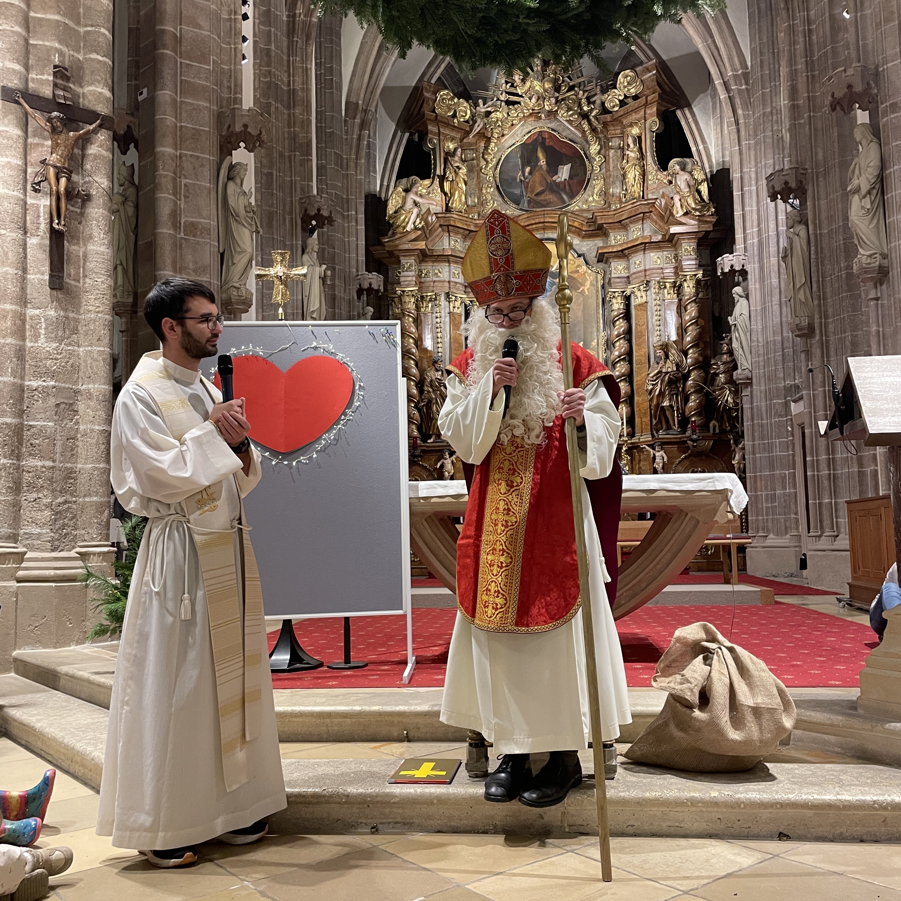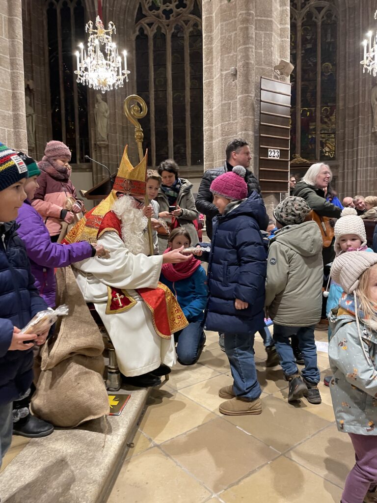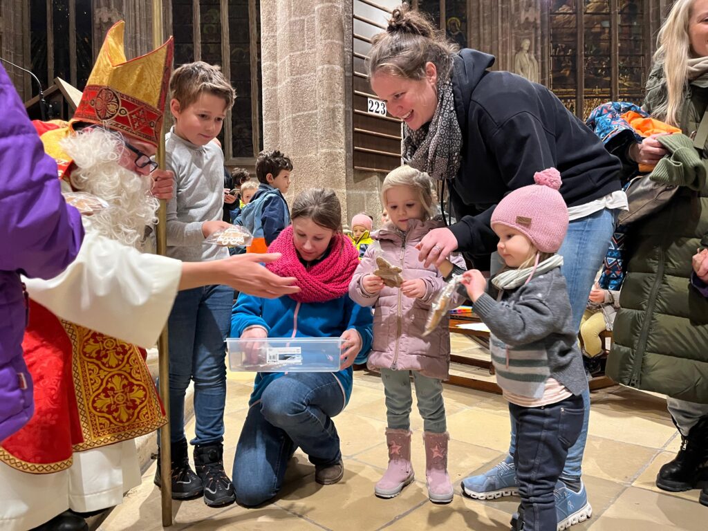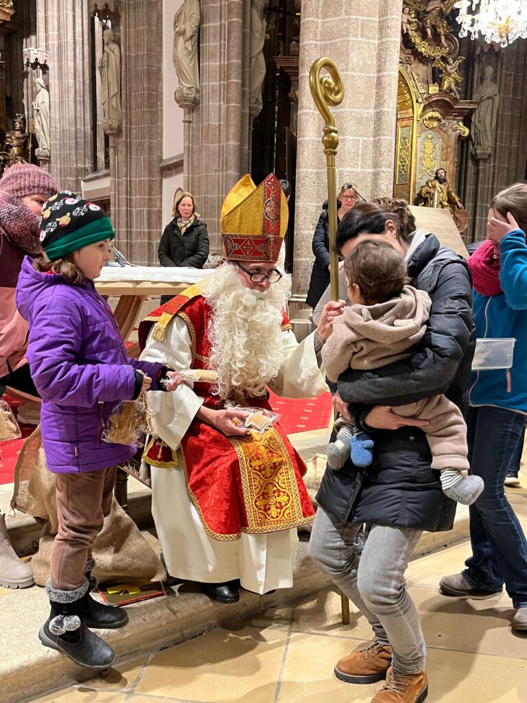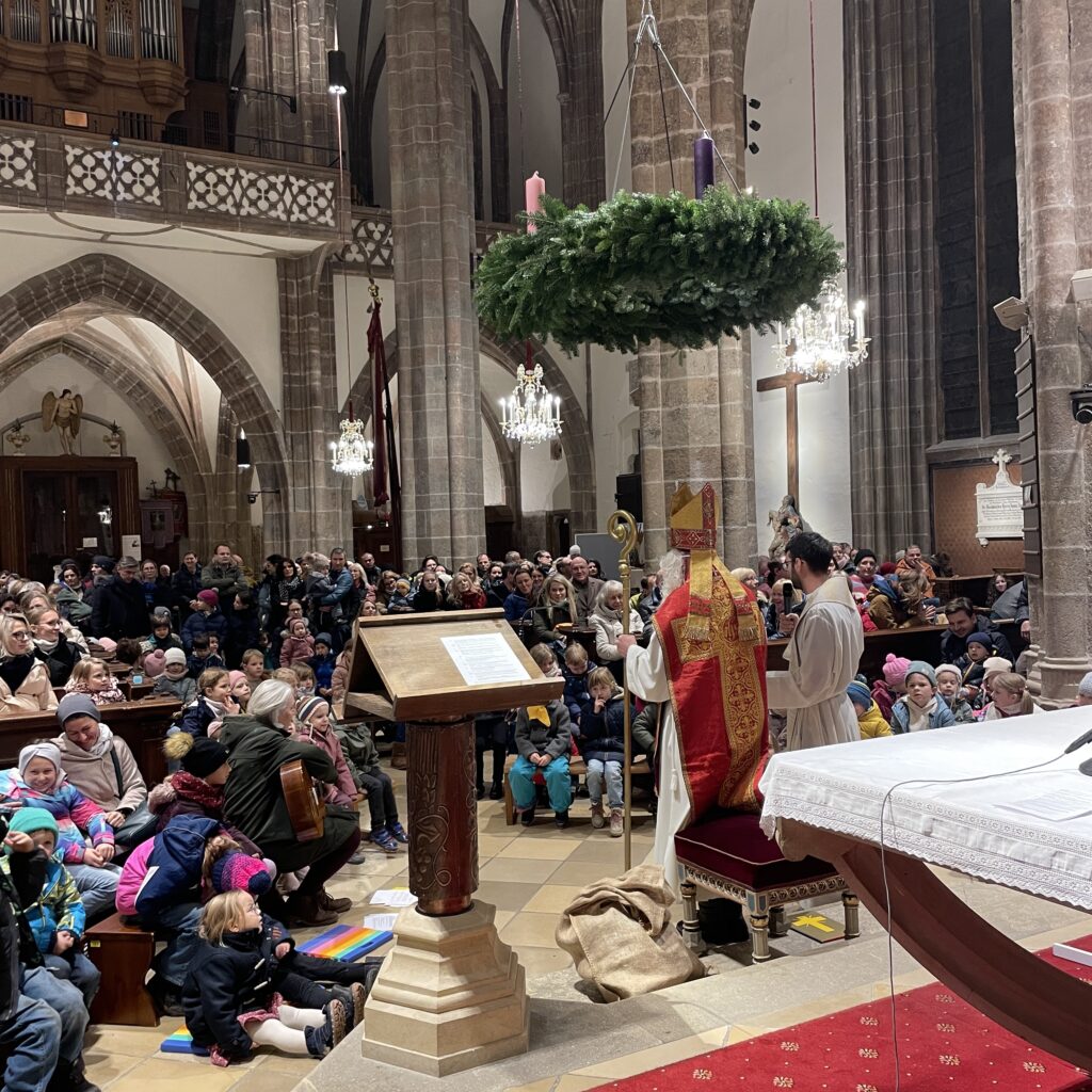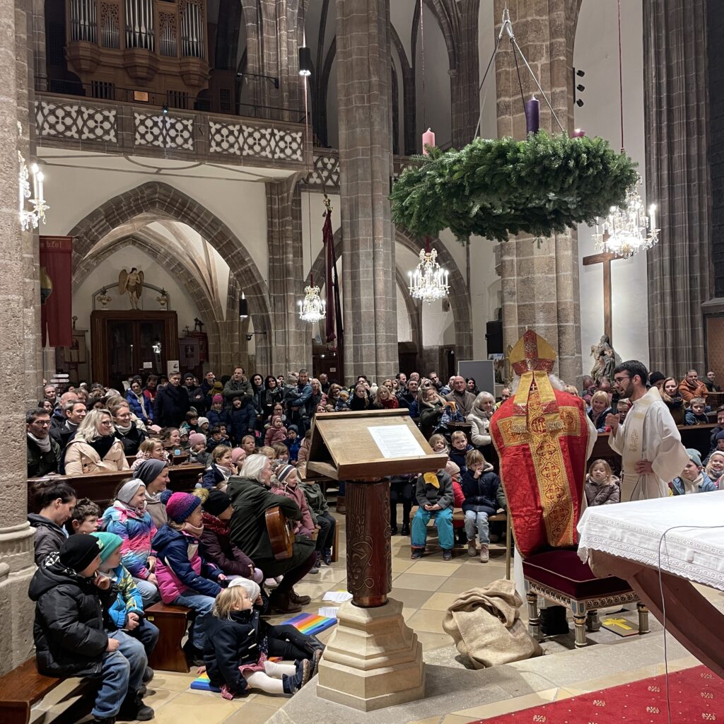 Große Aufregung herrschte am Samstag, dem 6. Dezember, als der Nikolaus an das große Eingangstor der Pfarrkirche klopfte! Mehr als 100 Kinder beobachteten mit großen Augen jede Bewegung des Nikolaus, der durch den Mittelgang nach vorne zum Altar schritt. Der großherzige Nikolaus wurde von allen freudig begrüßt. Doch ein junger Bursche sah furchtbar traurig aus. Schließlich erzählte er Nikolaus, dass er aus verschiedenen Gründen ein schweres Herz habe. Mit den Kindern wurde erörtert, wie er sein Herz wieder erleichtern könne. Helfen, teilen, für andere da sein – das macht unser Herz froh und warm. Der Kinderchor unter der Leitung von Ingrid Verbaeys sang dazu das passende Lied „Jeder ist ein Nikolaus“. Noch viele andere schöne Nikolauslieder wurden vom Kinderchor gesungen. Natürlich war der Sack des Nikolaus nicht leer und jedes Kind bekam einen köstlichen Lebkuchen-Nikolaus. Es war eine wunderschöne Feier und wir hoffen, dass nächstes Jahr der Nikolaus wieder in Perchtoldsdorf vorbeikommen wird.